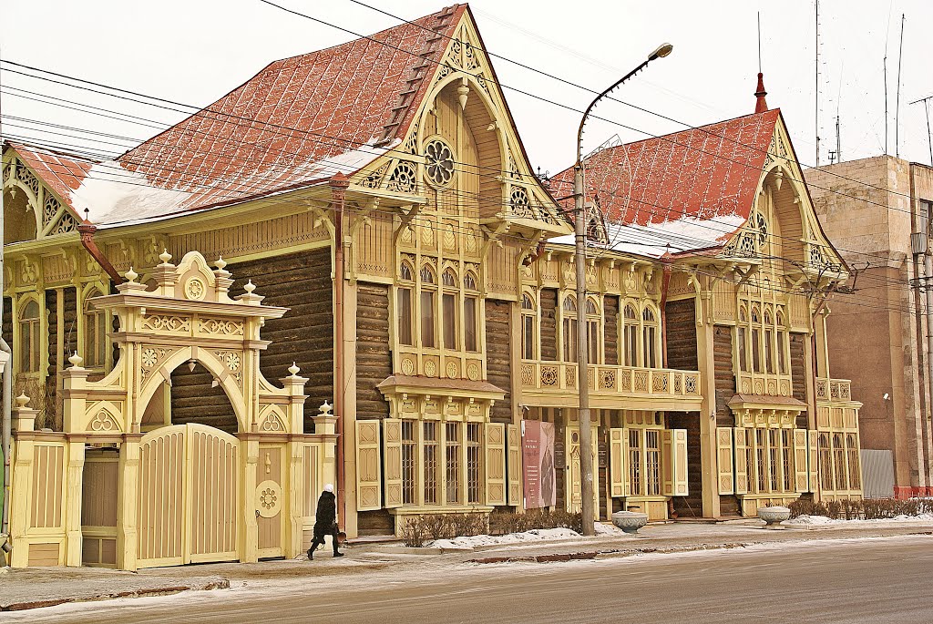 Двухэтажный деревянный дом с резными наличниками и ставнями в Красноярске Стоковое фото ©mors74 40153453